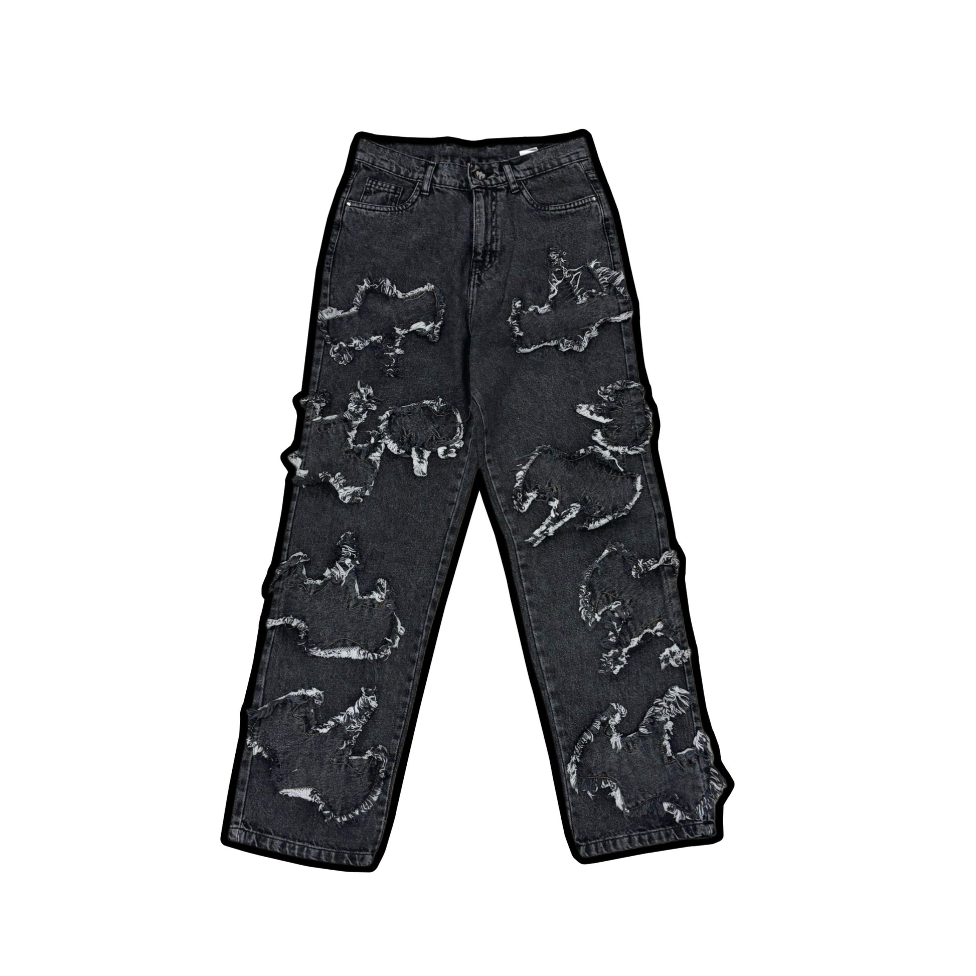The Ghost Denim Pants embody Phantom’s signature fusion of raw edge and contemporary design. Featuring bold frayed ghost motifs throughout, these jeans redefine distressed denim with a unique, rebellious aesthetic.